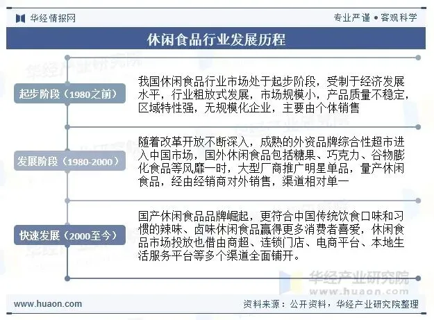 我国休闲食品行业发展可划分为三个阶段:20世纪80年代前为起步阶段,受经济水平限制,市场粗放式发展,规模小、质量不稳定,区域特性显著,以个体销售为主;80年代至本世纪初进入成长阶段,改革开放推动外资品牌及综合超市进入,国外糖果、巧克力等风靡,大型厂商通过量产明星单品经由经销商单一渠道销售;本世纪初至今为成熟阶段,国产辣味、卤味等符合传统饮食口味的产品崛起,多渠道全面铺开,涵盖商超、连锁门店、电商平台及本地生活服务平台,实现规模化与多元化发展。
