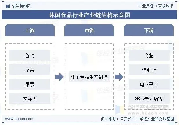 休闲食品行业产业链涵盖原料供应、生产加工、流通分销及终端消费四大核心环节。上游原料端以农副产品为主,包括谷物、坚果、果蔬、肉类、糖料等,依赖农业种植、养殖及初级加工;中游生产环节通过烘焙、膨化、卤制、糖渍等工艺将原料转化为成品,涉及食品加工企业、调味品厂商及包装材料供应商;下游流通端通过商超、便利店、电商平台、零食专卖店、社区团购等多渠道触达消费者。
