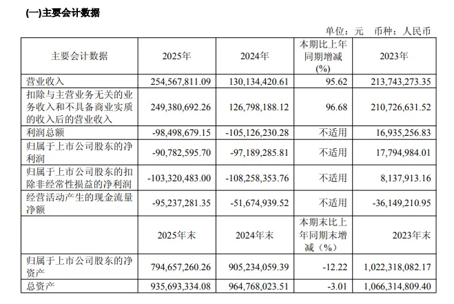 数据显示,公司2025年营业总收入达2.55亿元,同比增长95.62%;归母净利润为-9078.26万元,同比减亏640.67万元,减亏幅度达6.58%;扣非净利润为-1.03亿元,同比减亏493.79万元;经营现金流净额为-9523.73万元,现金流虽持续为负,但主要系研发投入、产能储备及市场拓展所致,具备合理性;基本每股收益为-1.24元,较上年有所改善。