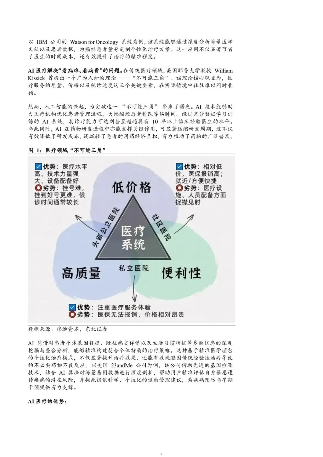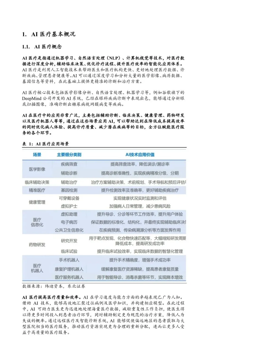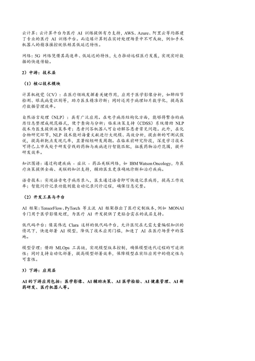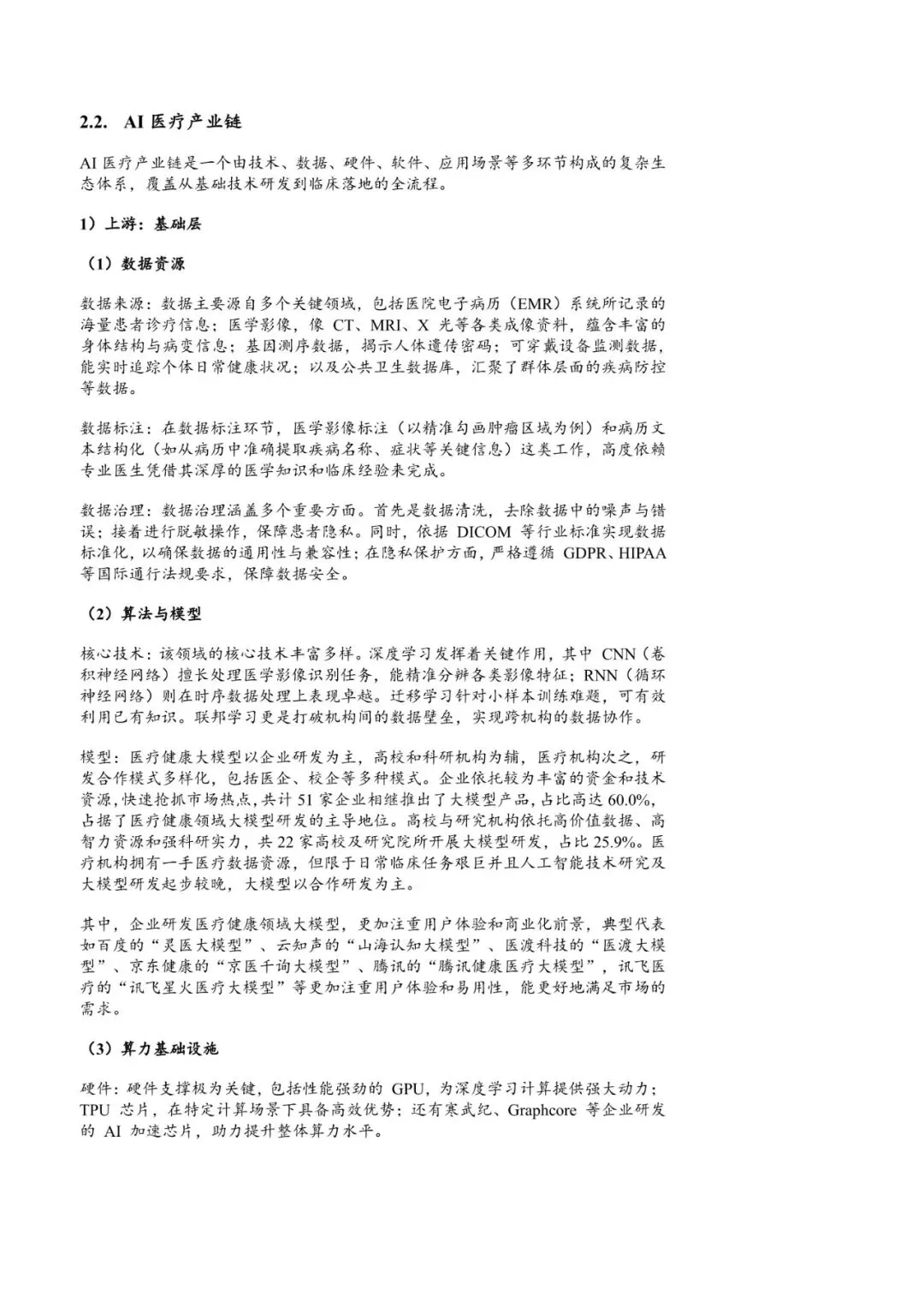 AI医疗是指通过机器学习、自然语言处理(NLP)、计算机视觉等技术,对医疗数据进行深度分析,辅助临床决策、优化诊疗流程、提升医疗效率的智能化应用体系。AI医疗是利用人工智能技术来帮助医生和医疗机构更快、更好地处理医疗数据、诊断疾病、管理患者健康等。AI可以通过深度学习和分析大量的医学影像、病历数据、基因信息等资料,在此基础上提供更精准的诊断和治疗方案。
