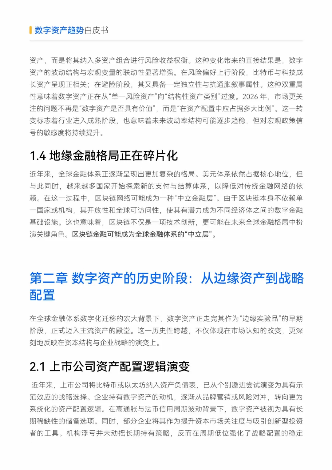 本白皮书围绕“从资产类别到金融体系”核心主线,全面解析2026年数字资产行业格局与未来十年发展方向。当前全球金融正形成 “主权金融体系 + 链上开放金融网络” 双层结构,数字资产深度嵌入全球流动性框架,完成从价格驱动向结构趋势驱动的转型。