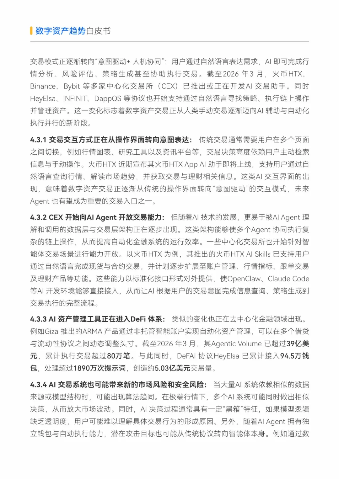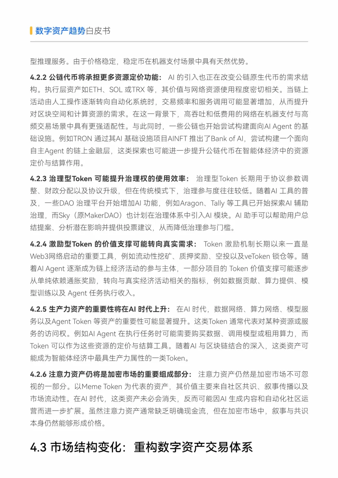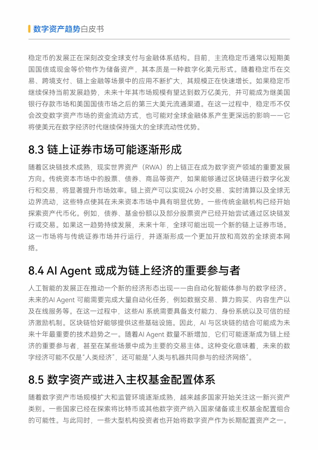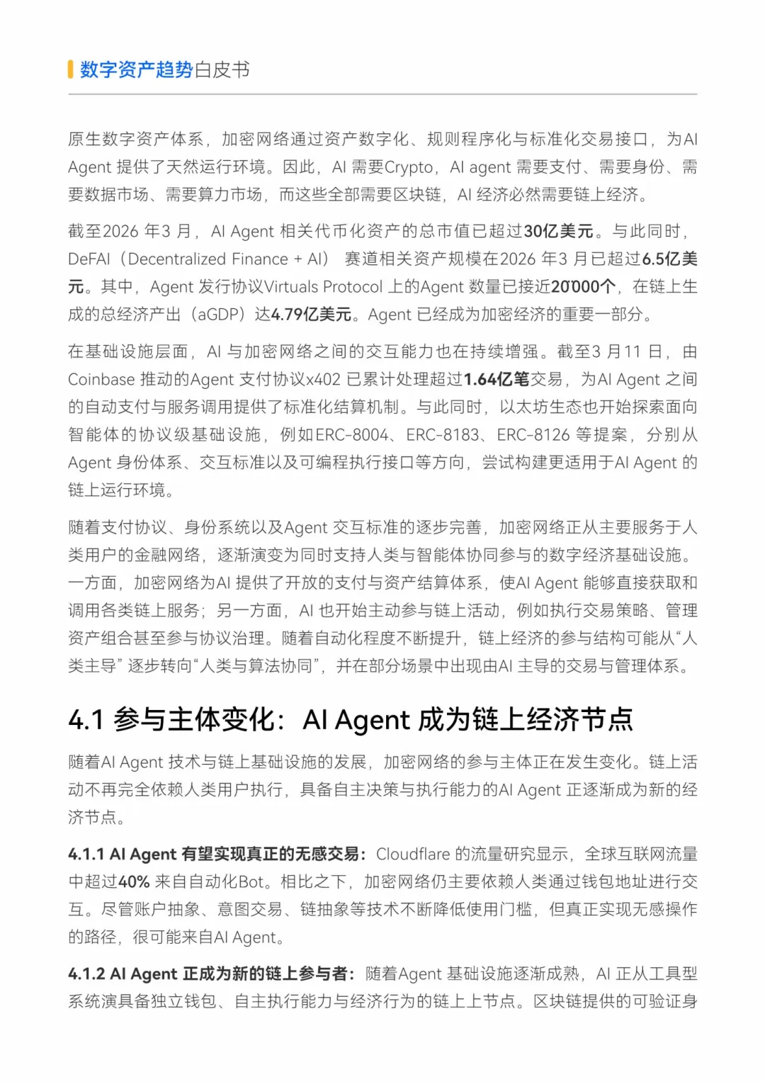 报告指出,数字资产已迈入主流配置阶段,机构通过直接持有、收益增强、基础设施投资三条路径规模化入场,托管与合规体系持续升级。技术层面,zkEVM 大规模应用、L2 转向 “胖应用”、抗量子与隐私化成为标配,夯实新金融底层基石。AI×Crypto 深度融合推动智能体经济崛起,AI Agent 成为链上经济节点,重构交易体系与 Token 价值逻辑,推动市场向“意图驱动 + 人机协同”转型。