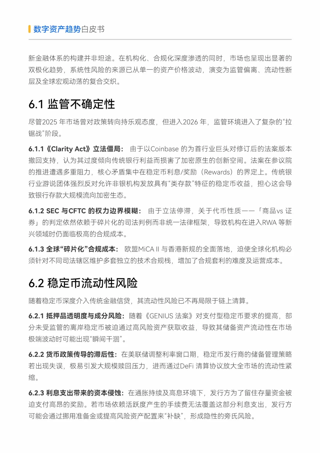 ✓风险预警:直面监管不确定性、稳定币流动性、市场竞争、系统性风险等关键挑战,提供风控与合规参考。