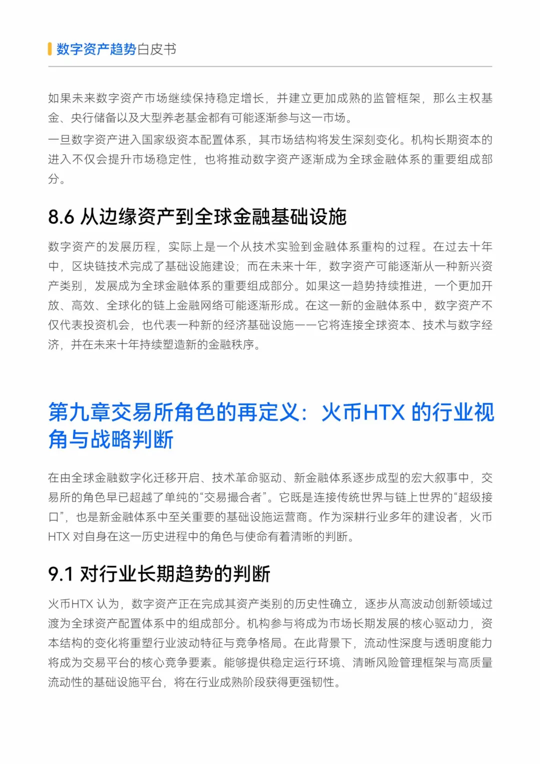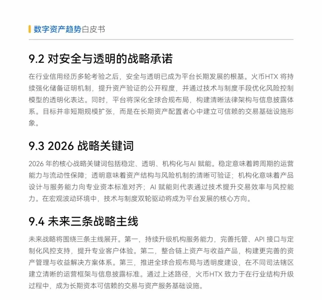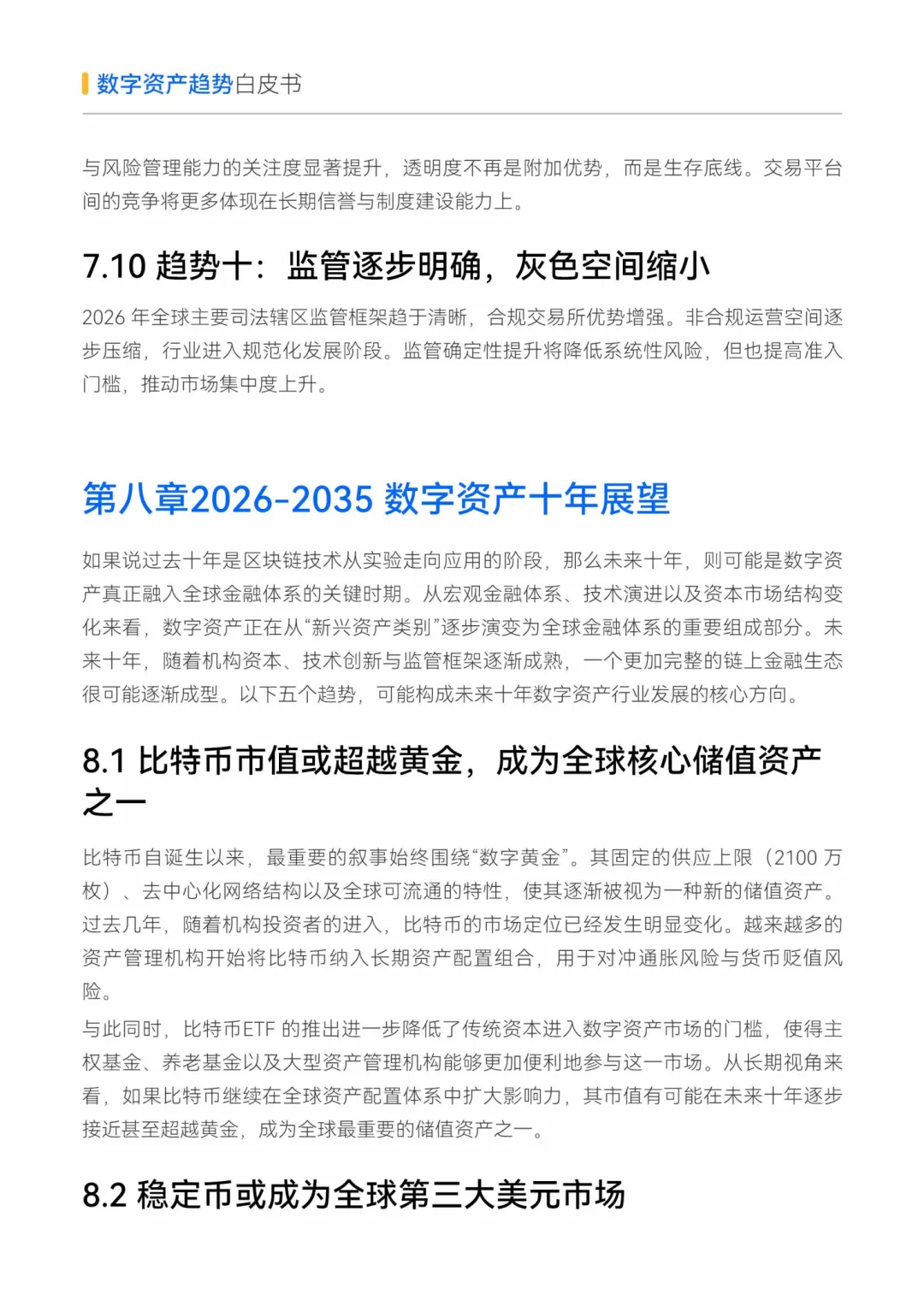 报告发布2026年十大趋势,明确BTC固化数字黄金定位、ETH成为收益核心载体、稳定币与 RWA 规模创新高、AI Agent 普及、监管逐步清晰等关键方向。中长期展望,比特币有望跻身全球核心储值资产,稳定币或成第三大美元市场,链上证券市场与智能体经济逐步成型,数字资产最终融入主权基金配置,成为全球金融基础设施。报告同时呈现火币 HTX 等平台的战略判断,为行业高质量发展提供实践参考。