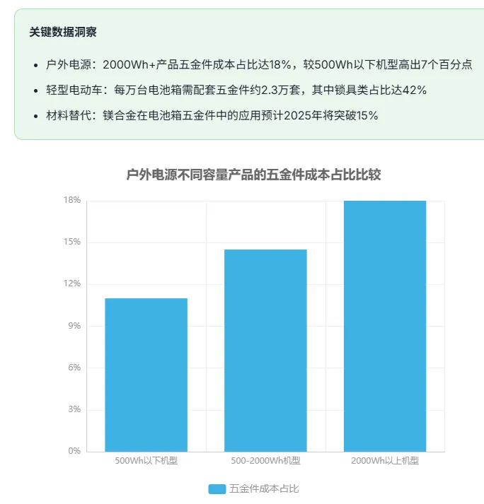 当前市场呈现“需求分层、技术定制”的特征,户外电源领域追求轻量化与多功能集成,而轻型电动车电池箱则侧重安全性与耐用性。这种分化趋势将推动工业箱体五金企业加速产品矩阵细分,为后续市场竞争格局演变奠定技术基础。