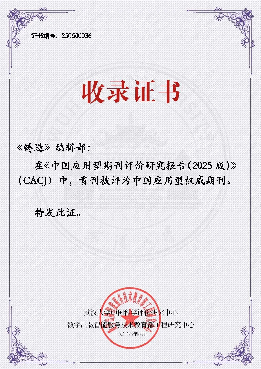 2026年4月10日,由武汉大学中国科学评价研究中心、数字出版智能服务技术教育部工程研究中心主办的第二届中国应用型期刊高质量发展研讨会在广西南宁隆重举行,会上正式发布《中国应用型期刊评价研究报告(2025版)》(以下简称《报告》)。《铸造》杂志凭借突出的行业影响力、学术质量与应用服务价值,成功入选装备制造领域应用型权威期刊,彰显在我国铸造与装备制造领域的标杆地位。