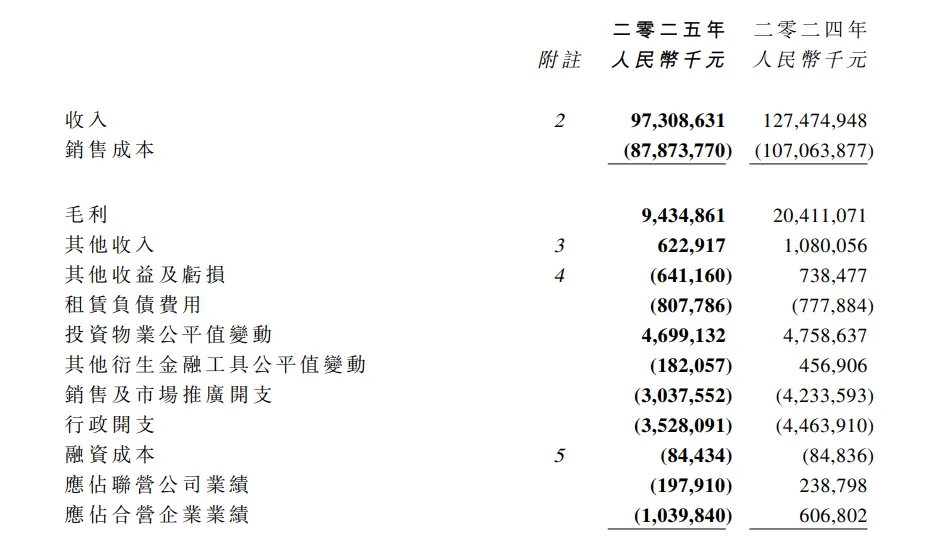 龙湖2025年报表面上保住了正数,实现营收973.1亿元、毛利94.35亿元、毛利率9.7%、归母净利10.22亿元,但同比全面下滑;剔除投资物业及其他衍生金融工具公允价值变动影响后,公司归母核心净利是亏损17亿元。