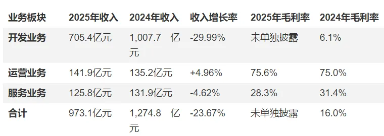 其二,真正的利润来源从“卖房”变成“收租+服务”,虽然营业收入上地产开发业务实现收入705.4亿元,运营业务收入141.9亿元,物业和代建组成的服务业务收入125.8亿元,但开发业务期内溢利由盈转亏,全年分部溢利亏损约81.4亿元,是核心亏损的主要拖累。