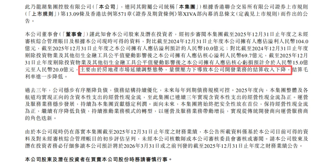 在业绩会上赵轶解释称:“2025年核心权益后利润亏损,是受地产市场量价持续下行影响,公司开发业务销售毛利率明显承压,该压力将在2025年、2026年结算中集中体现,属行业共性问题。”