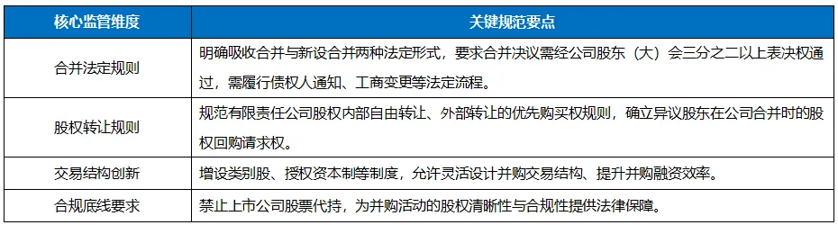 现行版本于2023年12月29日进行修订,以公司合并、股权转让规则为核心,明确了并购重组的法定形式与基础流程,核心规范要点如下: