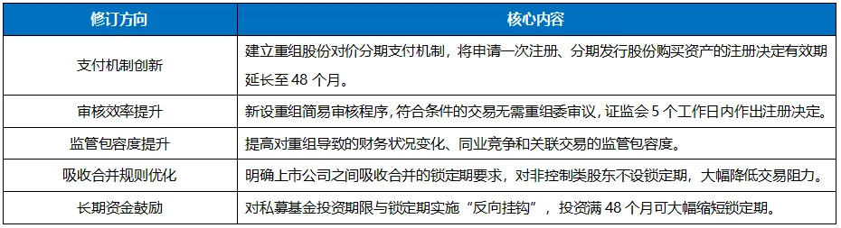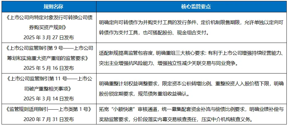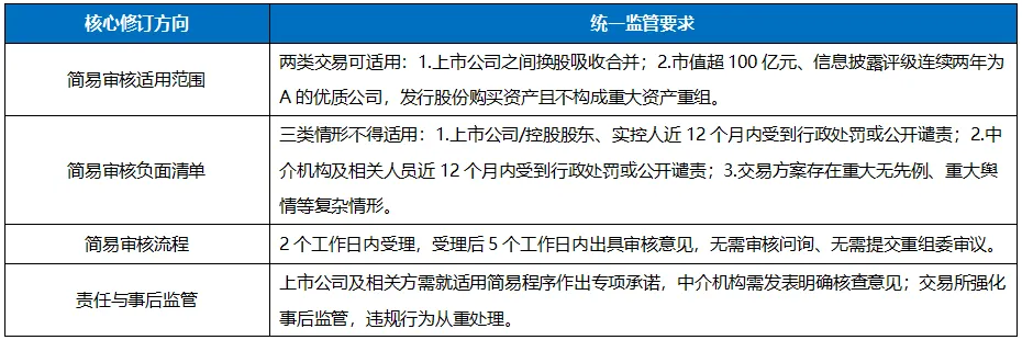 核心为三大交易所《上市公司重大资产重组审核规则》,2025年修订核心围绕优化审核程序、提高审核效率、增设简易审核程序展开,统一监管要求如下表: