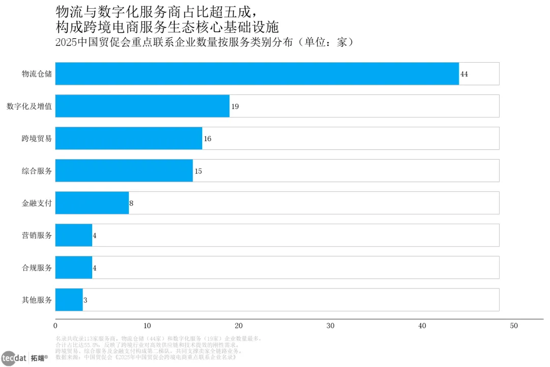 跨境电商的蓬勃发展离不开完善的服务生态支撑。在113家重点联系企业中,物流仓储企业数量最多,达44家,数字化及增值服务企业紧随其后,有19家,两者合计占比55.8%,构成了服务生态的核心。跨境贸易、综合服务、金融支付等企业则构成第二梯队,共同支撑卖家的全链路业务需求。