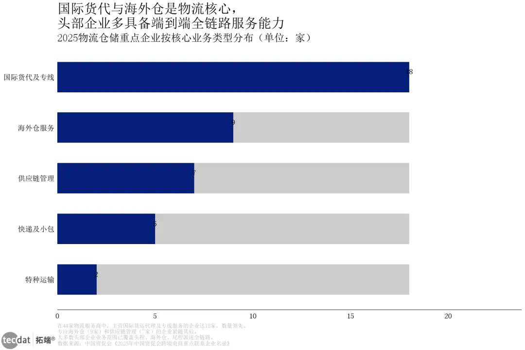 物流服务的细分领域中,国际货代及专线服务企业数量最多,达18家,海外仓服务和供应链管理企业分别有9家和7家,快递及小包、特种运输企业数量相对较少。大多数头部物流企业的业务范围已覆盖头程、海外仓、尾程派送全链路,具备较强的综合服务能力。