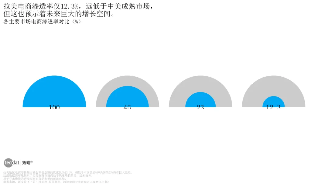 3秒解读:拉美电商渗透率仅为中美市场的三分之一到二分之一,未来增长潜力巨大,是跨境出海的重要增量市场。