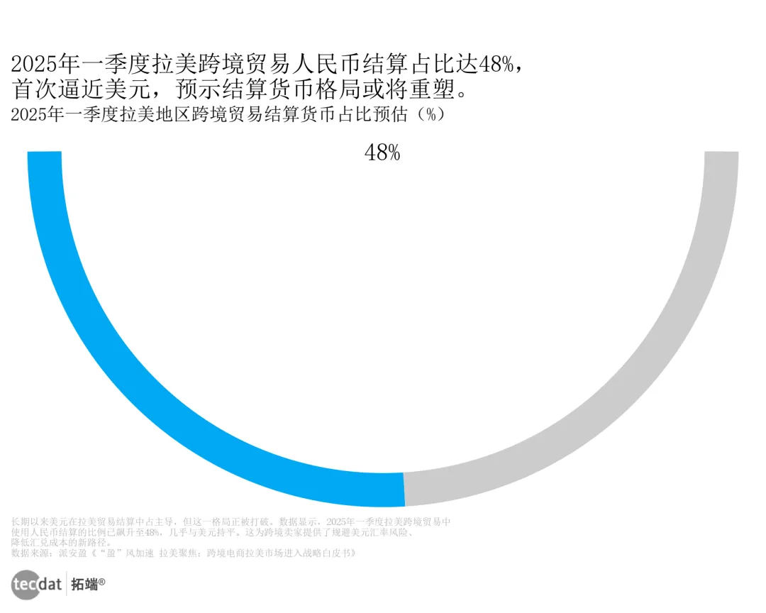 长期以来美元在拉美贸易结算中占主导,但这一格局正被打破。2025年一季度拉美跨境贸易中,使用人民币结算的比例已飙升至48%,几乎与美元持平。这为跨境卖家提供了规避美元汇率风险、降低汇兑成本的新路径。