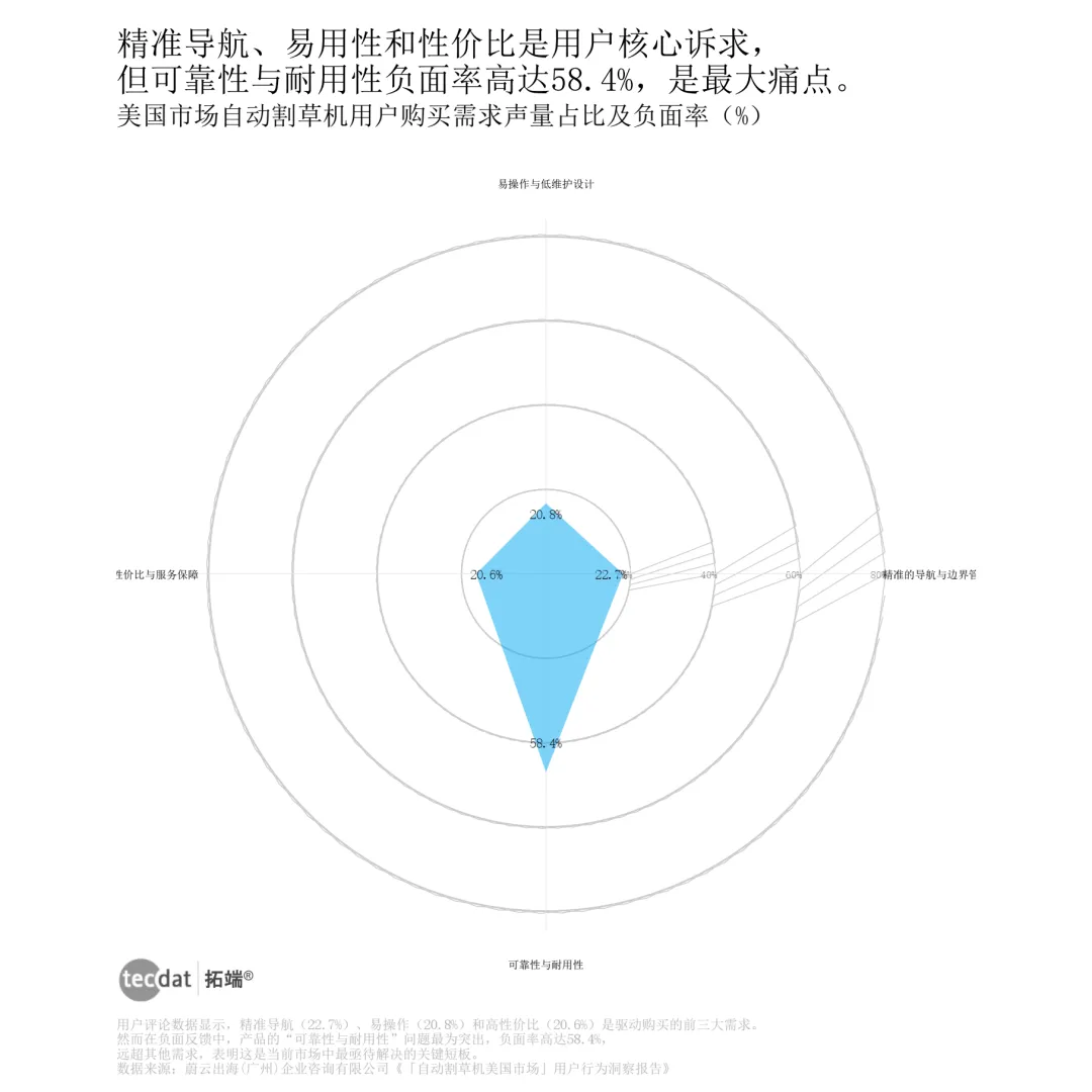 美国市场的自动割草机用户有着明确的需求痛点。精准的导航与边界管理、易操作与低维护设计、性价比与服务保障是驱动购买的前三大需求,声量占比分别为22.7%、20.8%和20.6%。然而在负面反馈中,产品的“可靠性与耐用性”问题最为突出,负面率高达58.4%,远超其他需求,表明这是当前市场中最亟待解决的关键短板。