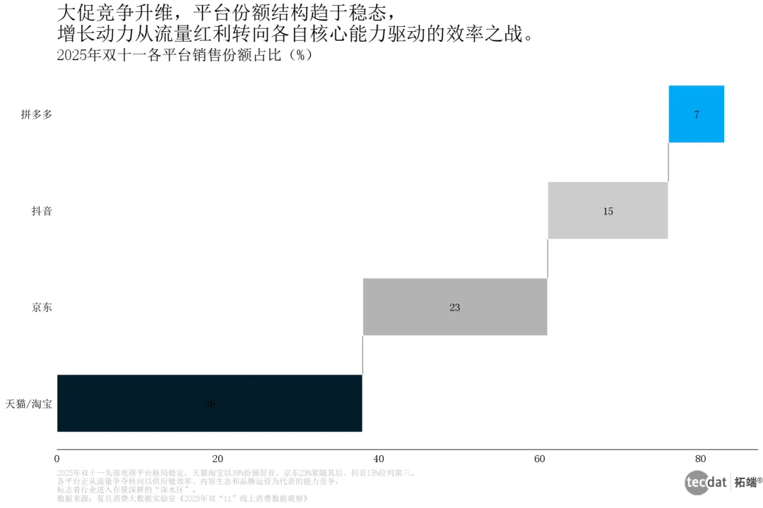 3秒解读:双十一平台份额格局稳定,头部效应明显,竞争从流量转向供应链、内容等核心能力。