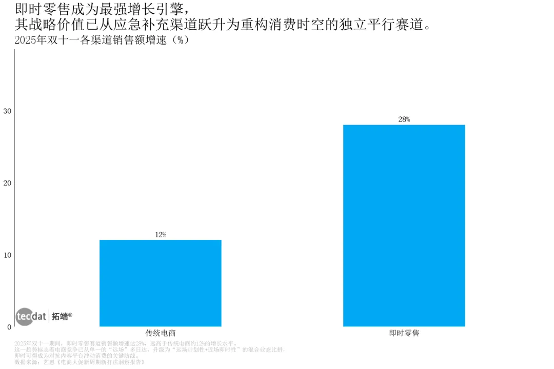 在渠道增速方面,即时零售表现亮眼。2025年双十一期间,即时零售赛道销售额增速达28%,远高于传统电商约12%的增长水平。这一趋势标志着电商竞争已从单一的“远场”多日达,升级为“远场计划性+近场即时性”的混合业态比拼,即时可得成为对抗内容平台冲动消费的关键防线。