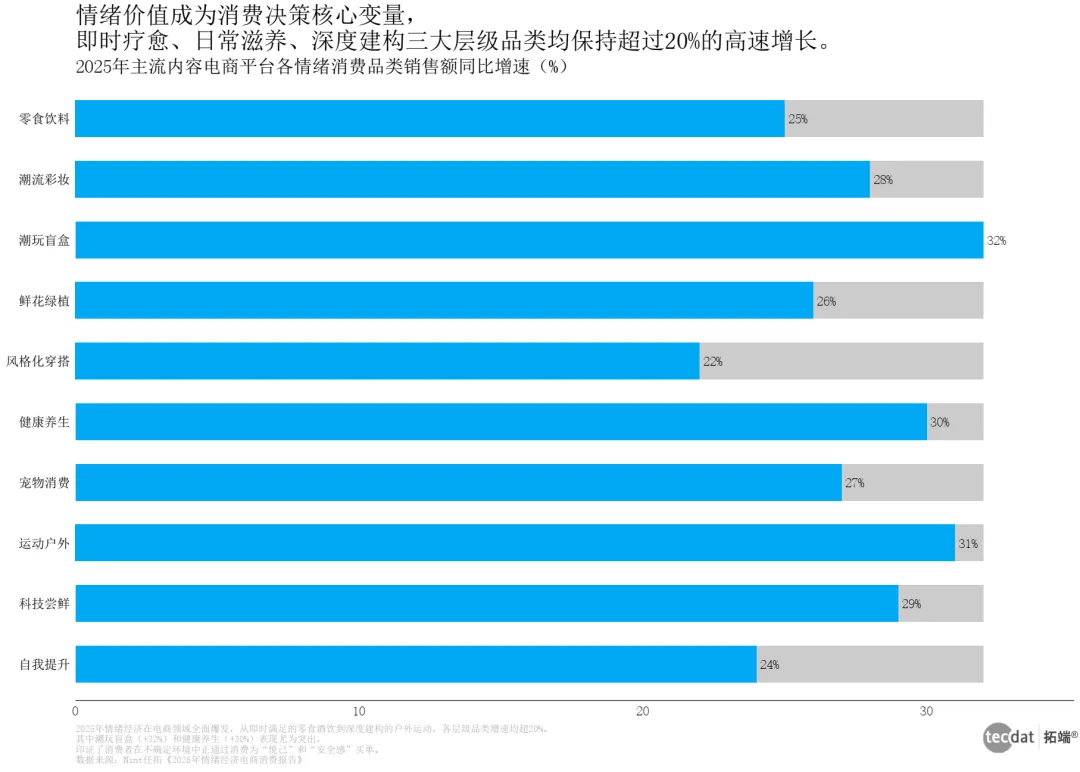 2025年情绪经济在电商领域全面爆发,从即时满足的零食酒饮到深度建构的户外运动,各层级品类增速均超20%。其中潮玩盲盒增速达32%,健康养生增速达30%,表现尤为突出,印证了消费者在不确定环境中正通过消费为“悦己”和“安全感”买单。