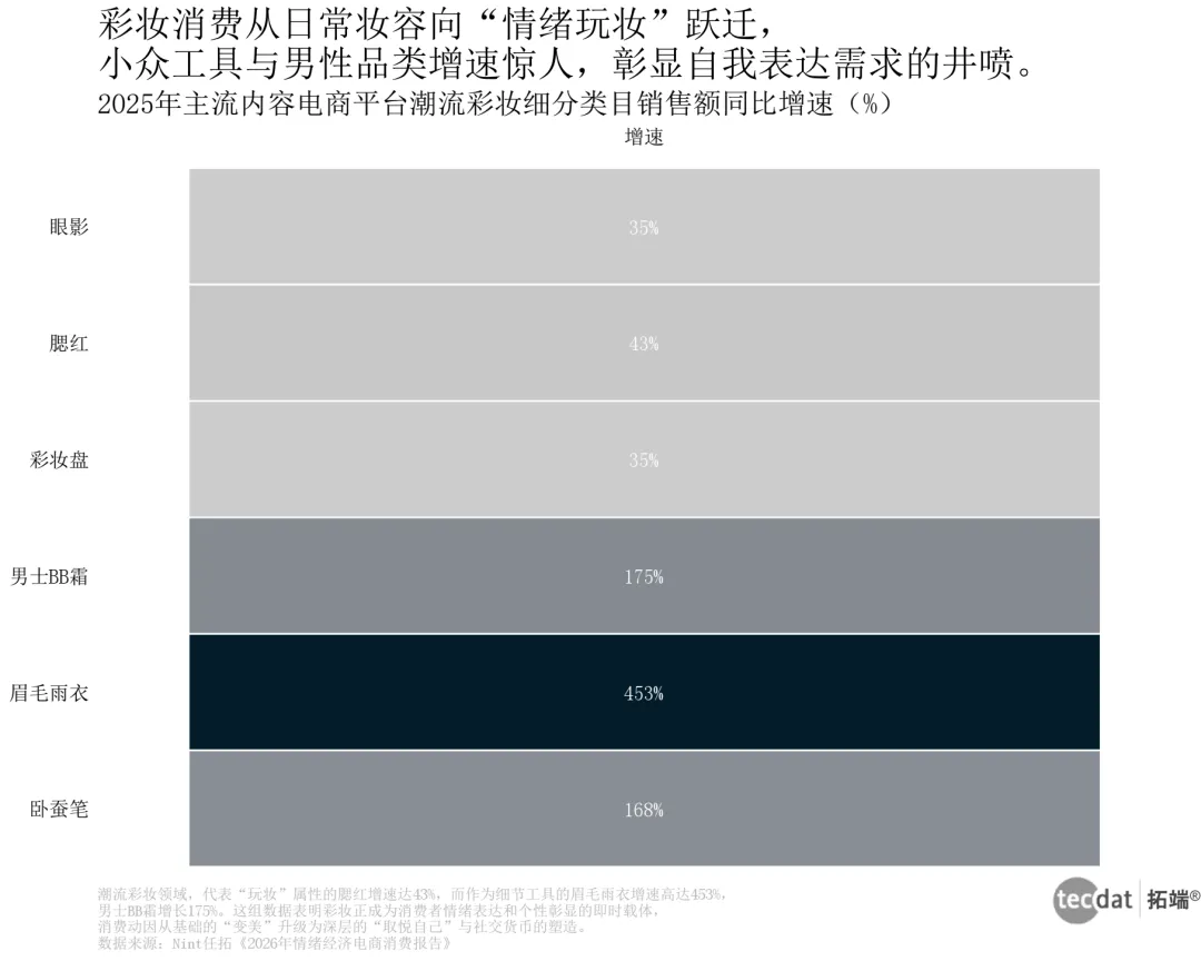 在潮流彩妆细分领域,消费趋势也从日常妆容向“情绪玩妆”跃迁。代表“玩妆”属性的腮红增速达43%,而作为细节工具的眉毛雨衣增速高达453%,男士BB霜增长175%。这组数据表明彩妆正成为消费者情绪表达和个性彰显的即时载体,消费动因从基础的“变美”升级为深层的“取悦自己”与社交货币的塑造。