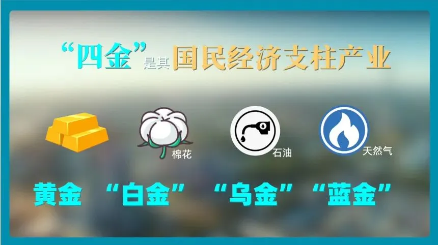第四,它靠“四金”出名:黄金、棉花(也叫白金)、石油(乌金)、天然气(蓝金)。