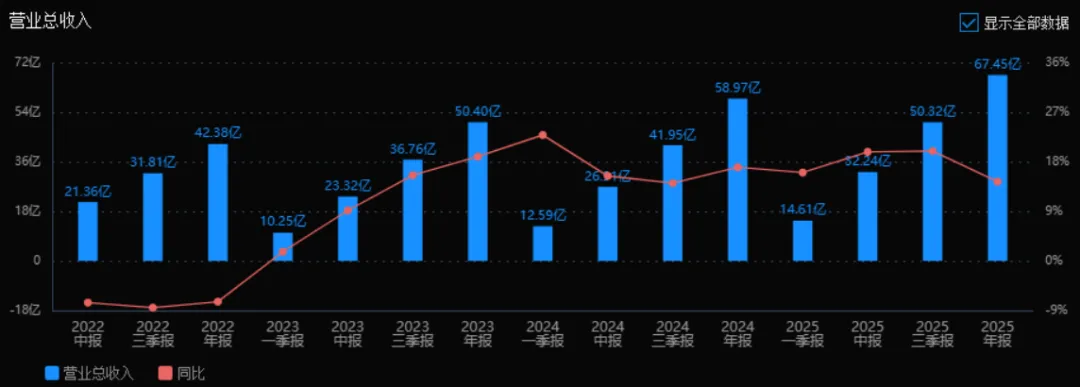 2025年营业总收入为 67.45亿元,相较于2024年的58.97亿元增长了 14.39%。评价: 公司营收保持稳健增长,增速较2024年(16.99%)略有放缓,但仍维持在两位数,显示出较强的市场拓展能力和业务稳定性。