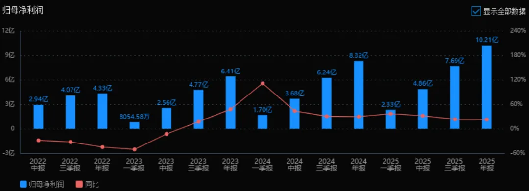 2025年归母净利润为 10.21亿元,相较于2024年的8.32亿元增长了 22.71%。评价: 利润增速显著高于营收增速,表明公司盈利能力增强,可能得益于成本控制、产品结构优化或规模效应。
