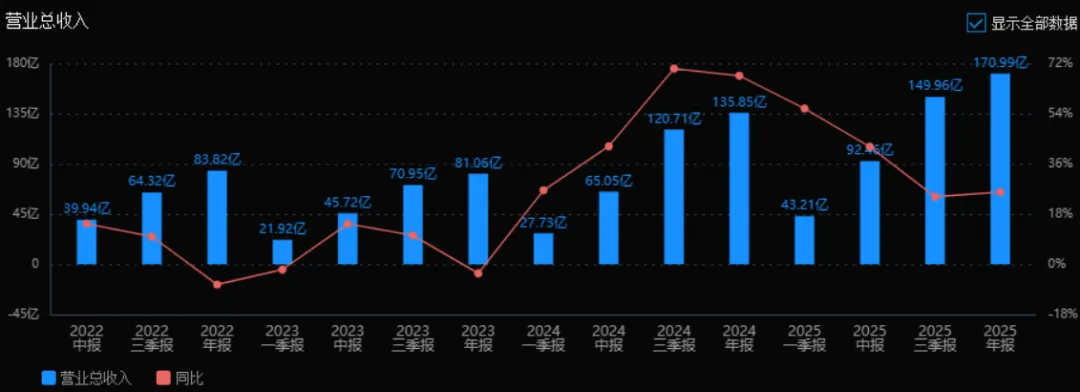2025年营业总收入为 170.99亿元,相较于2024年的135.85亿元增长了 25.86%。评价: 公司保持了较为强劲的营收增长态势,尽管增速较2024年的67.60%有所放缓,但在高基数下仍实现超25%的同比增长,说明主营业务仍具扩张能力。