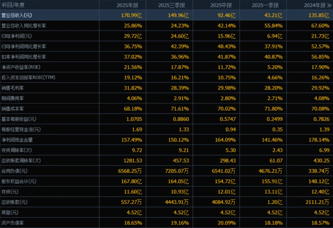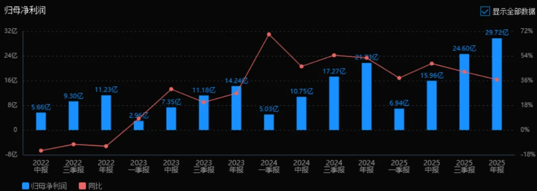2025年归母净利润为 29.72亿元,相较于2024年的21.73亿元增长了 36.75%。评价: 净利润增速高于营收增速,表明公司盈利能力增强,成本控制或产品结构优化效果明显。相比2024年的52.57%增速有所回落,但仍处于健康增长区间。