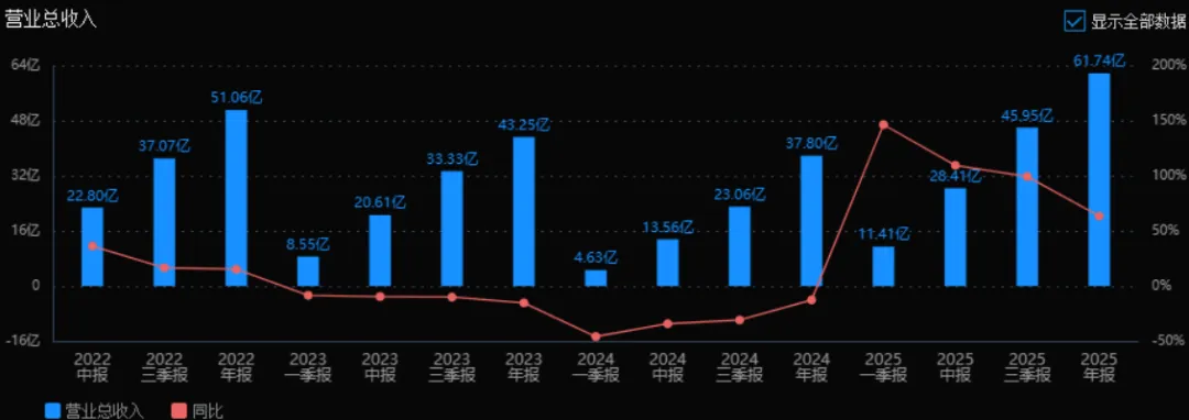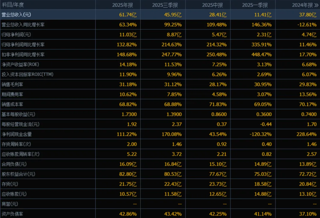 2025年营业总收入为 61.74亿元,相较于2024年的37.80亿元,增长了 63.34%。评价:公司营收实现高速增长,增速从2024年的负增长(-12.61%)显著反转,表明公司业务扩张能力强劲,市场需求旺盛或产品竞争力大幅提升。