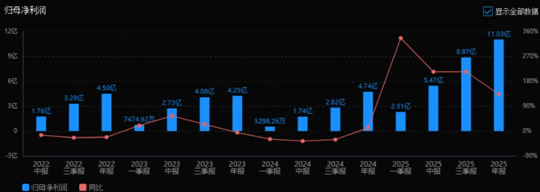 2025年归母净利润为 11.03亿元,相较于2024年的4.74亿元,增长了 132.82%。评价:净利润增速远超营收增速,显示出公司盈利能力大幅提升,规模效应或成本控制能力增强,盈利质量较高。