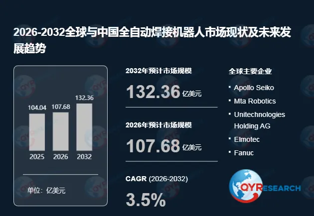 根据QYR(恒州博智)的统计及预测,2025年全球全自动焊接机器人市场销售额达到了104.0亿美元,预计2032年将达到132.4亿美元,年复合增长率(CAGR)为3.5%(2026-2032)。