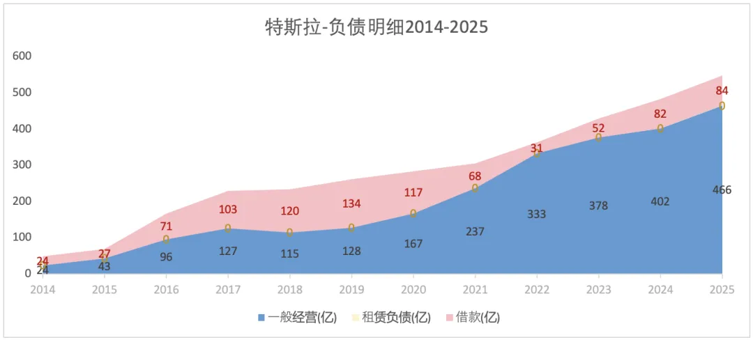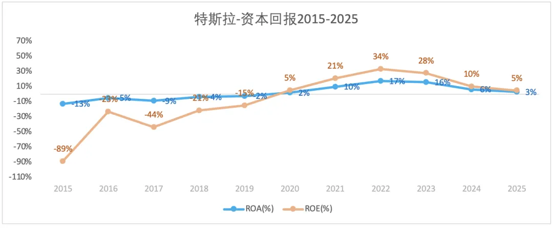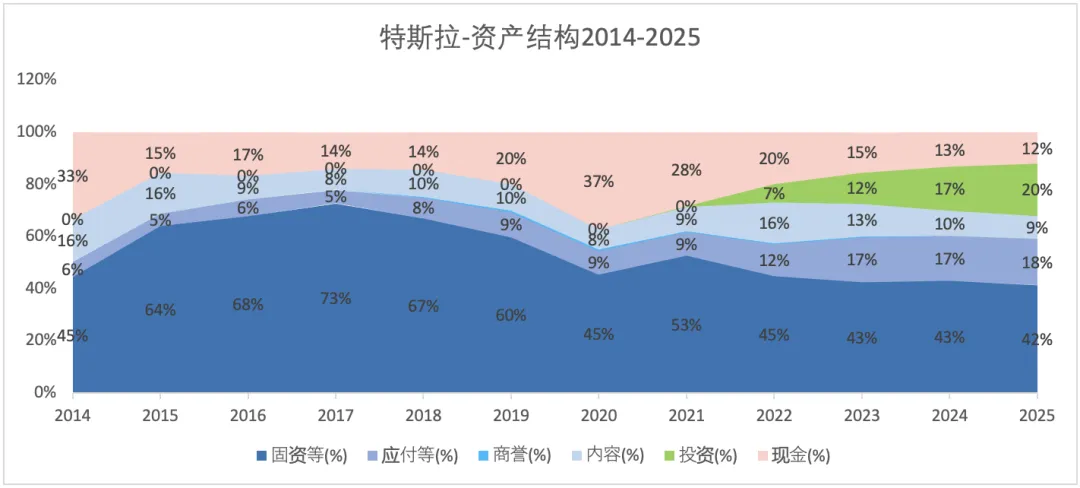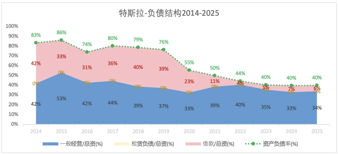 特斯拉从2019年开始不断降低财务杠杆,资产负债率从2018年的79%降至2025年末的40%。在分析过的车企中(比亚迪、吉利、上汽、长安、赛力斯、理想、小鹏)中是最低的。2024年末和2025年末特斯拉的资产负债率约为40%,其它车企基本都在60%以上。