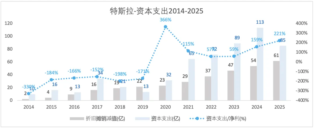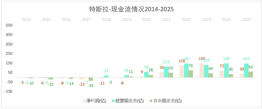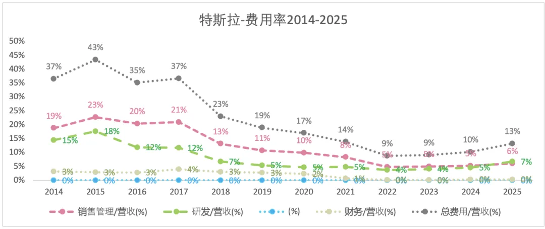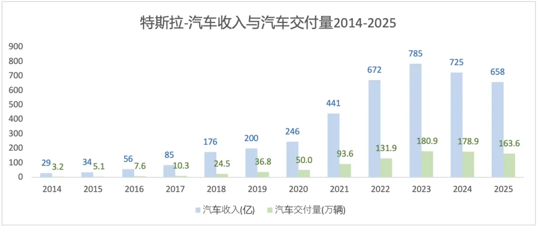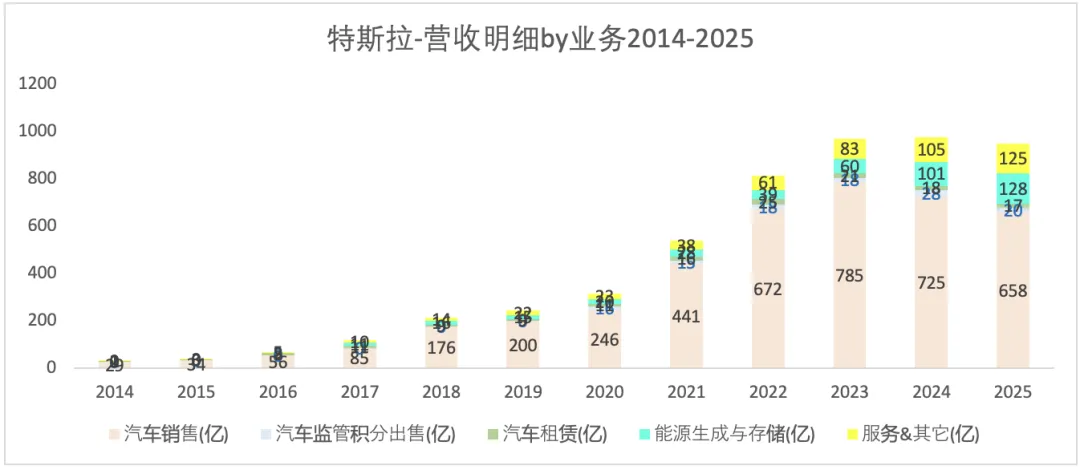 特斯拉的营收,从2014-2023年是不断增长的过程,其复合增长率约为46%;但2024-2025增长停滞。