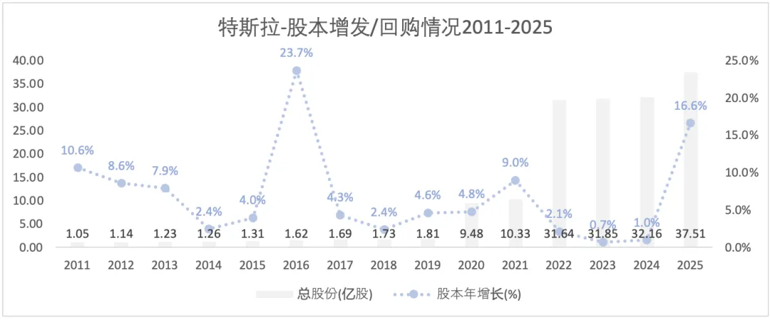 特斯拉几乎每年都有股本增发。