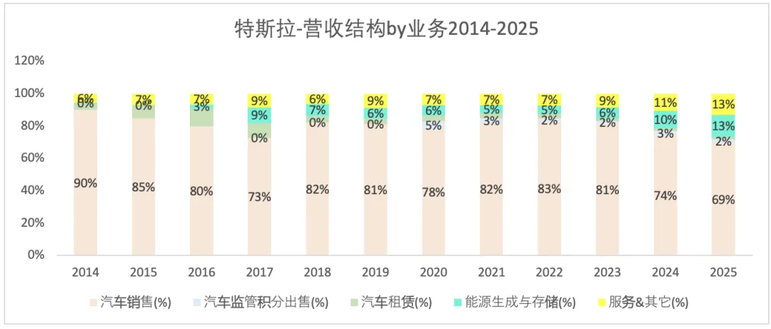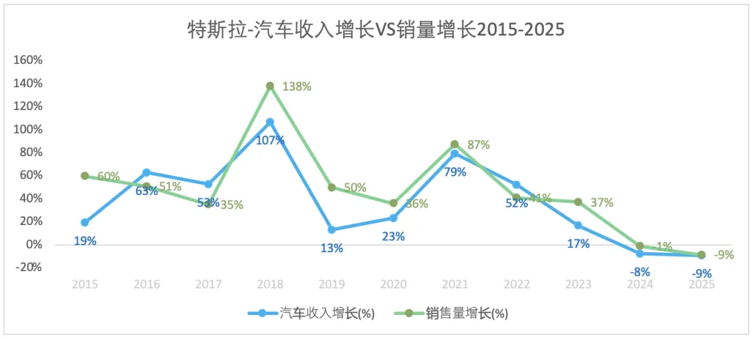特斯拉的营收中,汽车销售收入占了大头。2024年的营收增长停滞和2025年的营收下降皆是因为汽车销售收入的下降所致,虽然部分被储能和服务收入的增长所抵销。