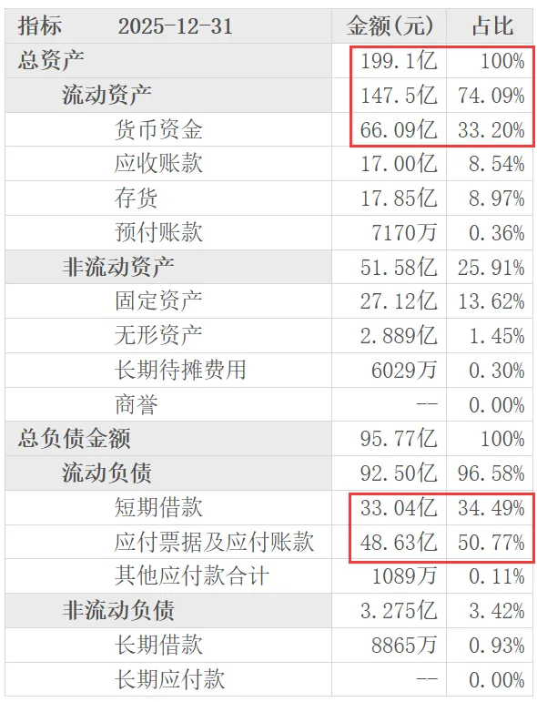 资产负债表,整体看情况还是非常不错的,资产质量很高,流动资产占了绝大部分,除了货币、应收账款、存货,还有交易性金融资产和其他流动资产。负债较高,但大部分是应付账款,还有短期借款。