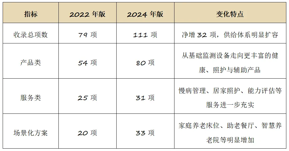 这一点,从最新供给结构中看得很清楚。与《智慧健康养老产品及服务推广目录(2022年版)》相比,2024年版目录已经明显扩容。2022年版共收录79项,其中产品类54项、服务类25项;2024年版增至111项,其中产品类80项、服务类31项,两年间净增32项。这个变化本身就说明,智慧健康养老正在从“有产品”走向“成体系”。