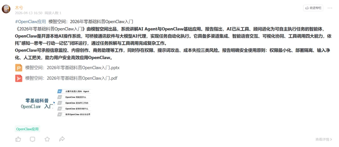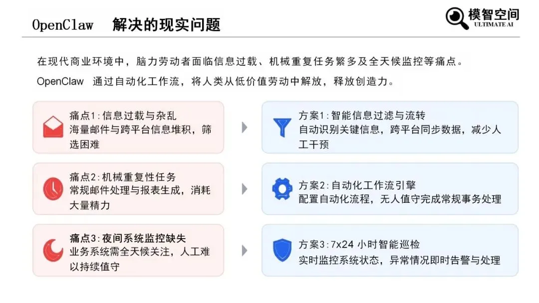 OpenClaw可承担信息监控、内容创作、商务助理等工作,同时存在权限、提示词攻击、成本失控三类风险。报告明确安全使用原则:权限最小化、部署隔离、输入净化、人工把关,助力用户安全高效应用OpenClaw。
