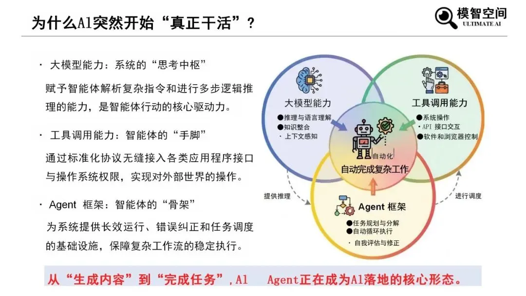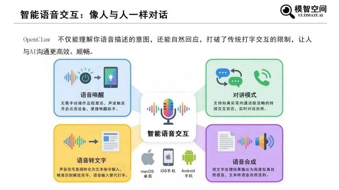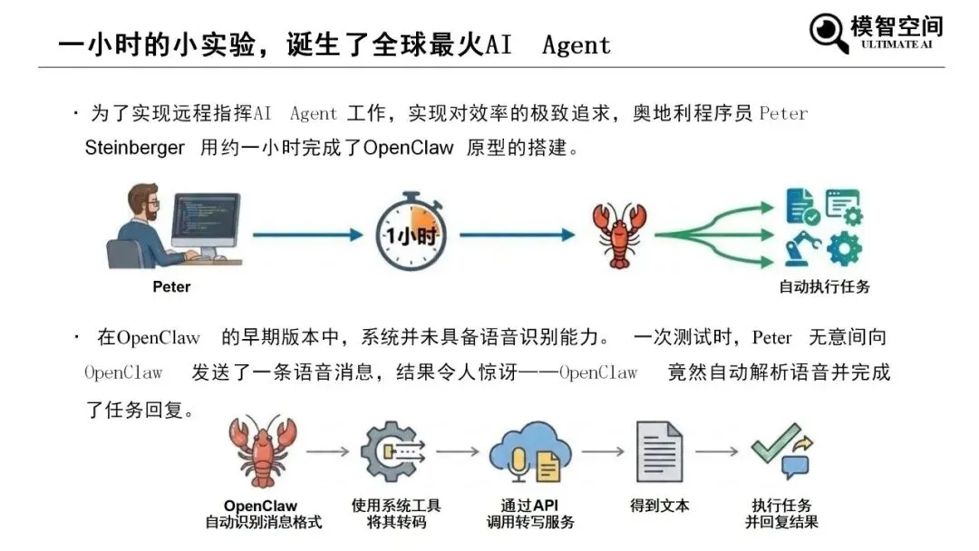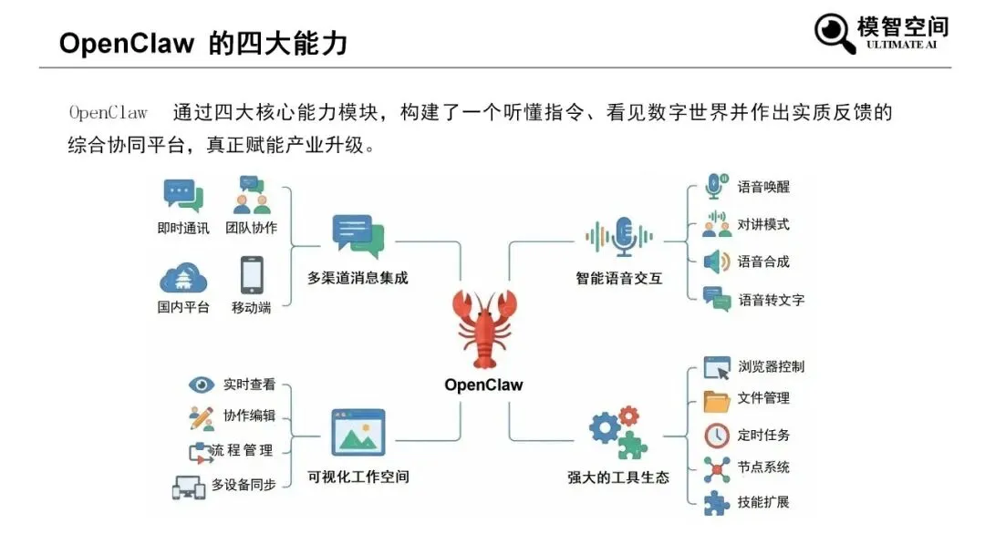 《2026年零基础科普OpenClaw入门》由模智空间出品,系统讲解AI Agent与OpenClaw基础应用。报告指出,AI已从工具、顾问进化为可自主执行任务的智能体,OpenClaw是开源本地AI操作系统,可桥接通讯软件与大模型AI代理,实现任务自动化执行。它具备多渠道集成、智能语音交互、可视化协同、工具调用四大能力,依托“感知—思考—行动—记忆”闭环运行,通过任务拆解与工具调用完成复杂工作。