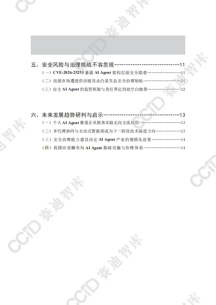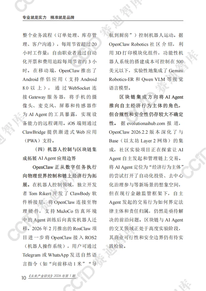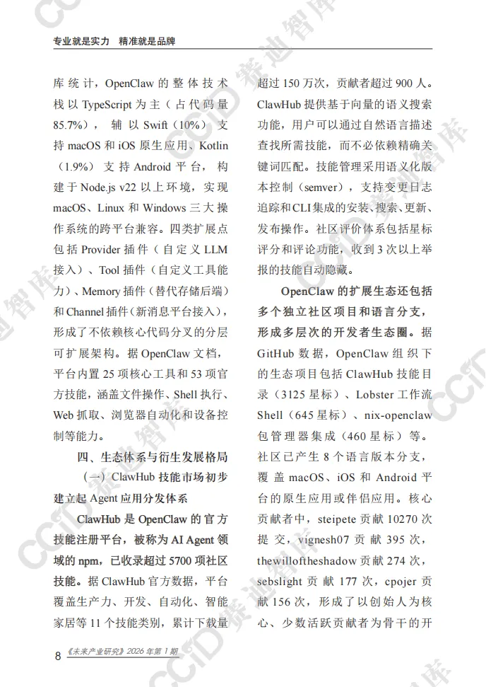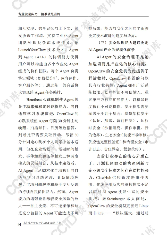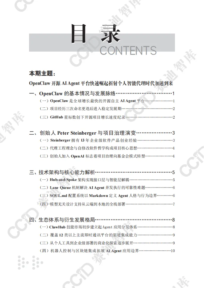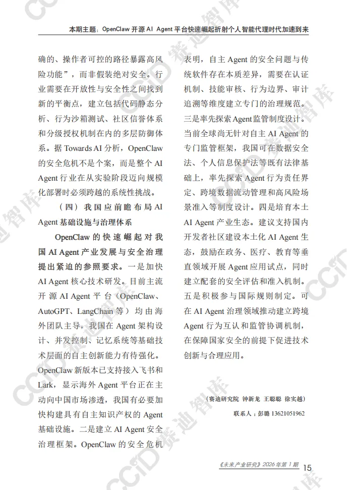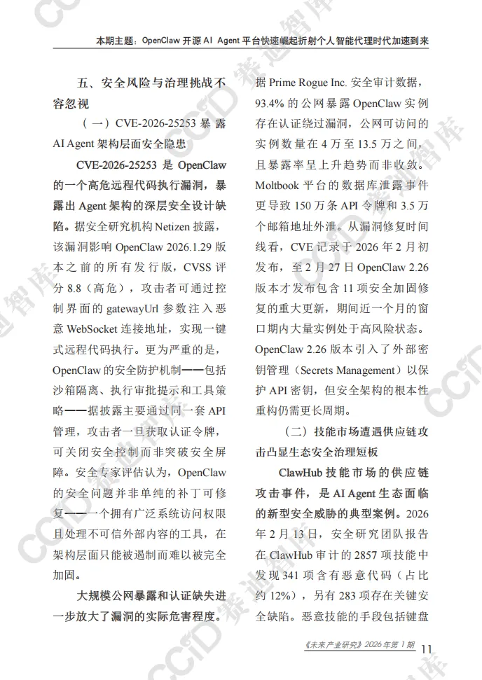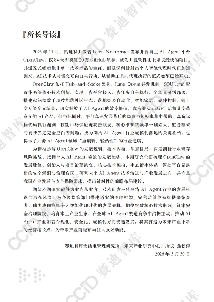 本报告以快速崛起的OpenClaw为典型样本,系统剖析开源自主AI Agent平台的技术内核、生态格局、安全隐患与产业趋势,揭示个人智能代理时代已加速到来,AI正从对话交互向自主执行深度变革。 OpenClaw作为全球增长最快的开源AI Agent项目,凭借Hub-and-Spoke架构、Lane Queue并发机制、SOUL.md人格配置体系等核心技术,实现多平台接入、多任务自主执行与全场景部署,可完成邮件管理、文件操作、网页自动化、硬件控制等实际任务,大幅提升个人与企业效率。项目依托社区生态构建起包含数千项技能的ClawHub市场,覆盖办公、家居、开发、机器人控制等多元场景,并逐步向企业级服务延伸。其爆发式增长标志着AI Agent从极客实验走向主流应用,成为继大模型之后的新一轮技术变革焦点。 与此同时,行业安全与治理短板突出。OpenClaw暴露出远程代码执行高危漏洞,ClawHub技能市场频发供应链攻击,项目过度依赖单一创始人维护,且全球范围内针对自主AI Agent的监管规则、责任界定均处于空白状态,成为规模化落地的核心制约。 报告指出,未来AI Agent将朝着多代理协同、主动式智能、轻量化部署方向演进,安全治理能力将决定产业发展上限。个人智能代理市场规模将持续高速扩张,应用从数字任务延伸至物理世界与链上经济。 对此,我国应抢抓战略机遇,加快自主AI Agent架构、并发控制、记忆系统等核心技术攻关,建立覆盖认证隔离、技能审核、行为审计的全流程安全治理框架,率先探索监管与责任界定规则,培育本土开源生态,并积极参与国际规则制定,推动我国在全球个人智能代理赛道占据主动,实现安全与创新协同发展。