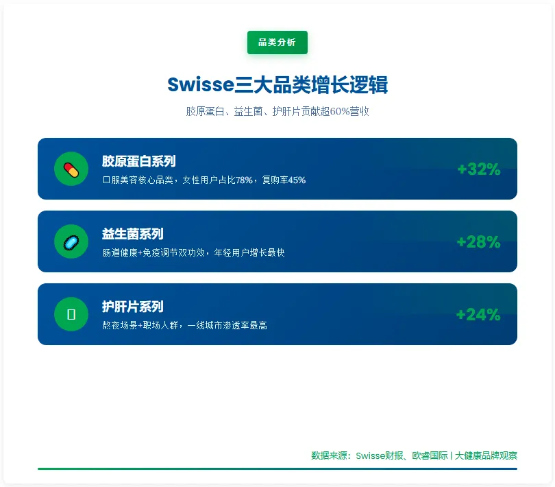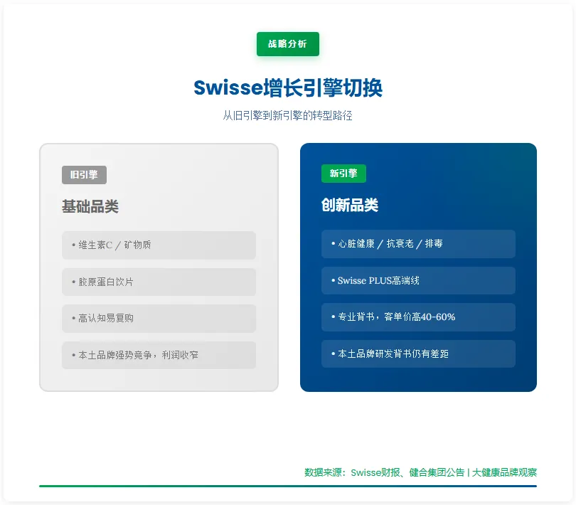 这是Swisse连续多年在两大核心市场保持领先的延续,但值得注意的是,增长引擎正在切换——从基础维生素/矿物质的存量竞争,转向"心脏健康/抗衰老/排毒"三大创新品类的增量开拓。