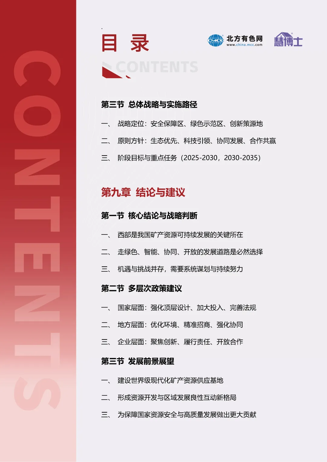 本报告基于翔实的数据与案例分析,遵循“战略分析-现状评估-路径设计”的逻辑框架,首先系统梳理了西部主要省区的资源禀赋、分布格局与资源潜力;全面评估了当前勘探开发进展、技术能力、产业链协同水平以及面临的生态约束。进而,报告深入剖析了在基础设施、产业协同、政策制度、技术创新等关键领域的现状、问题与需求。通过借鉴国内外资源型地区开发经验,并结合西藏铜矿、川西锂矿、新疆产业集群等典型实践,报告明确了西部地区有色金属资源开发的战略定位,即打造国家战略资源保障区、绿色开发示范区与产业创新策源地。