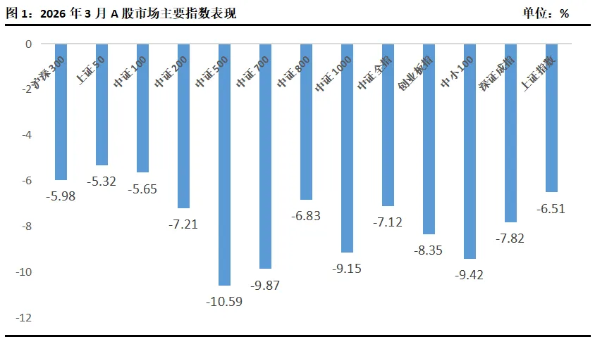 3月A股深度调整,主要指数全线收跌。沪指全月跌6.51%,从月初4197.23点高点下探,3月23日一度跌破3800点,最大回撤达9.5%;深市跌幅更深,深证成指跌7.82%,创业板指跌8.35%,科创50跌幅超10%。大小盘分化显著,大盘指数相对抗跌,上证50跌5.32%;中小盘指数深度回调,中证500跌10.59%。板块极端分化,资金抱团银行、煤炭、公用事业等防御板块,半导体、AI算力、新能源赛道遭重挫。尽管月末出现企稳迹象,但市场信心恢复仍需时间,外部地缘冲突仍可能持续影响权益市场。
