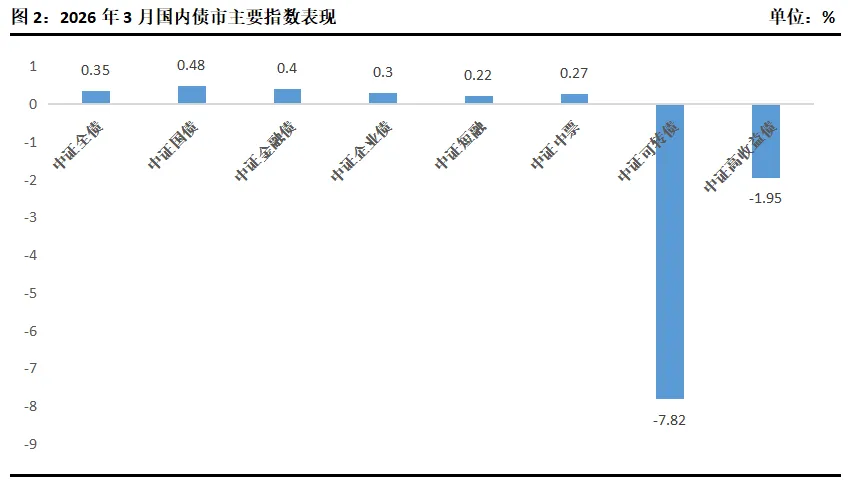 3月债市在权益市场恐慌情绪下成为资金避风港,纯债市场韧性凸显,但权益类债品深度回调。纯债指数全线飘红,中证全债指数月度上涨0.35%,较2月涨幅明显扩大;其中利率债领涨,中证国债指数涨0.48%,中证金融债涨0.40%,信用债同步走强但涨幅分层,中证企业债、中票、短融分别涨0.30%、0.27%、0.22%,资金向高评级利率债避险集中。