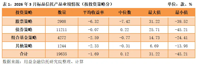 3月存量标品信托产品的收益表现大幅走低,债券策略成为避风港。纳入统计47家信托公司的19635款存续产品中,3月整体平均收益率为-1.69%,环比减少2.05个百分点;中位数收益率为0.12%,环比减少0.11百分点。其中,收益为正的产品数量10839款,占比达到55.20%。A股主要指数全线大跌,中证500、中证1000等中小盘指数跌幅超9%;纯债指数逆势上涨,可转债、高收益债随股市深度回调。极端行情下,不同策略产品表现差距被显著放大。