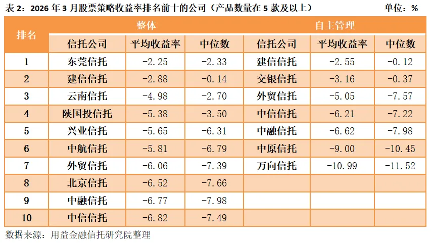 从自主管理的产品看,3月信托公司自主管理的股票策略产品披露净值的有177款。建信信托自主管理股票策略业绩领跑,核心投研能力最强。交银信托自主管理产品表现稳健,位居第二。