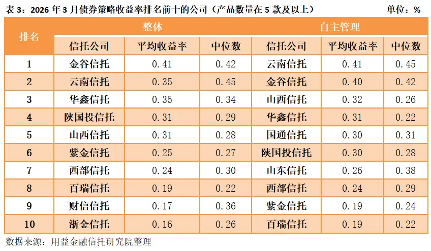 3月信托公司自主管理的债券策略产品中,披露净值的有8258款。自主管理类表现较好的信托公司与整体情况类似,金谷信托、云南信托的债券策略信托产品的业绩表现最优。