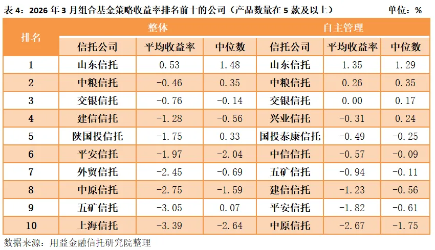 自主管理的637只组合基金策略产品中,山东信托自主管理的组合基金策略信托产品的业绩领跑;中粮信托、交银信托的产品业绩稳健,保持正收益;兴业信托的平均收益率虽为负、但中位数为0.24%,表现稳定。