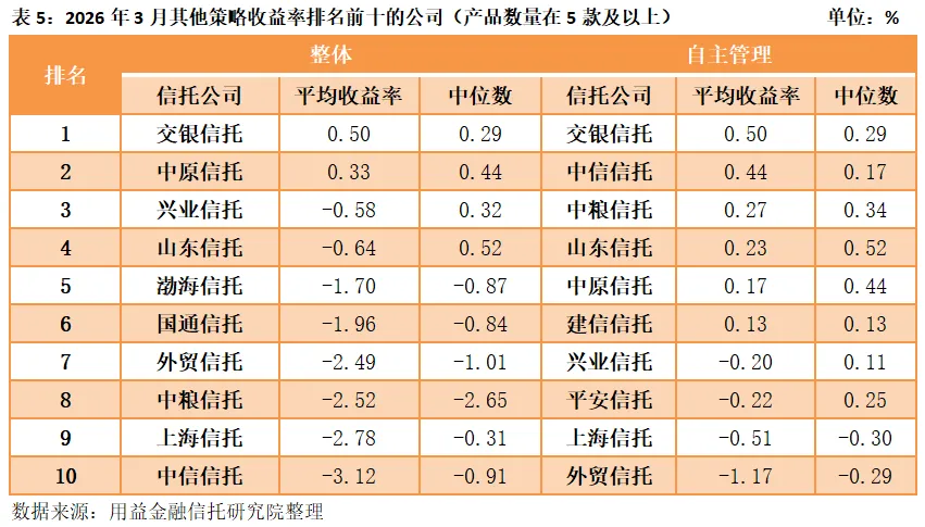 前十机构中,交银信托、中原信托的其他策略产品平均收益率、中位数收益率两大指标表现优异,均保持为正收益;兴业信托、山东信托的其他策略信托产品的平均收益率和中位数收益率均优于行业均值,中位数收益率表现优异。